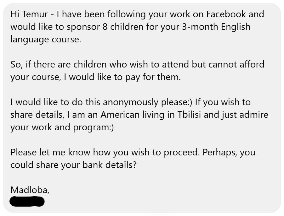 პიროვნებამ სურვილი გამოთქვა, დარჩენილი თვეები რვა მოსწავლეს სრულად დაუფინანსოს.