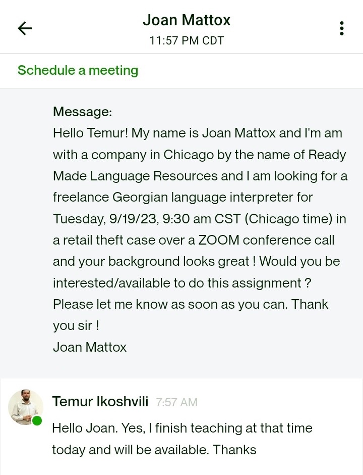 “თემურ, გიკავშირდებით ჩიკაგოდან (ილინოისის შტატი). ჩვენ ვეძებთ ქართულ-ინგლისურ თარჯიმანს 19 სექტემბერს. საქართველოს დროით 18:30 საათზე დაგვჭირდება მომსახურების გაწევა. კომუნიკაცია ზუმის საშუალებთ მოხდება. თუ იქნებით თავისუფალი ამ დროისთვის? გვაცნობეთ, როგორც კი შეძლებთ.”