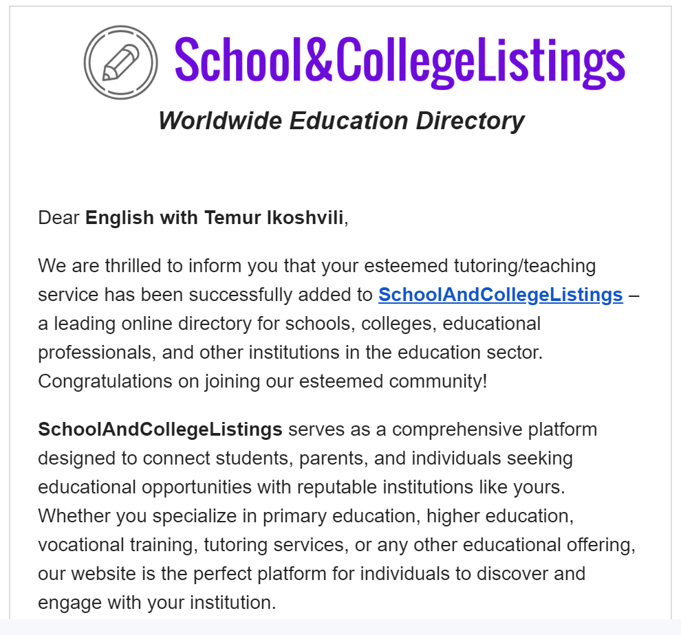 “English with Temur Ikoshvili, გაცნობებთ, რომ თქვენი სწავლება დაემატა School And College Listings-ს.